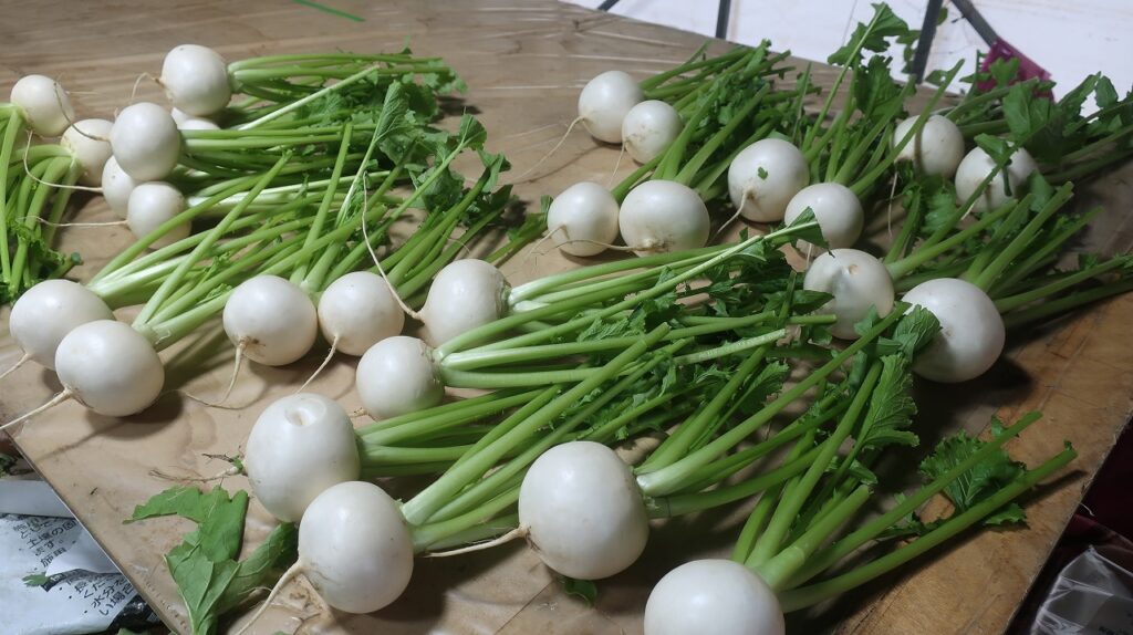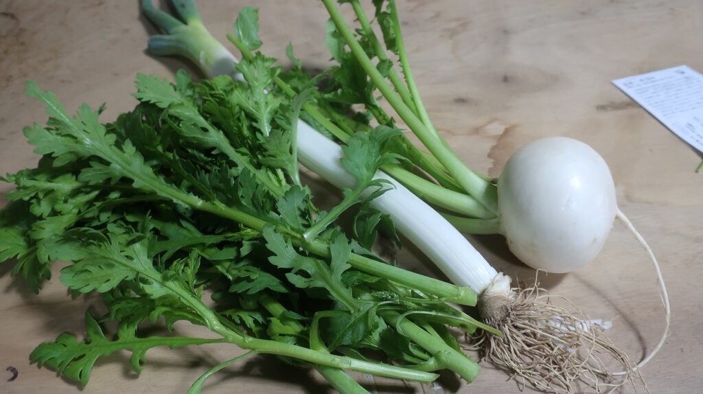 で、長ねぎ、春菊、かぶ、もらってきました。