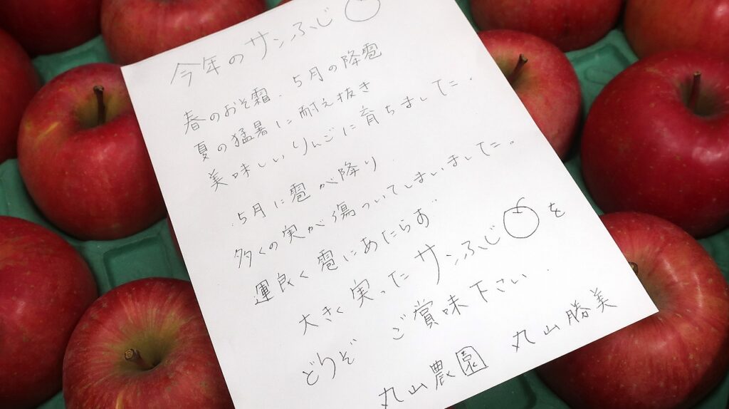 サンふじは運良く雹の被害に会わず、大きく実りましたと書いてあります。