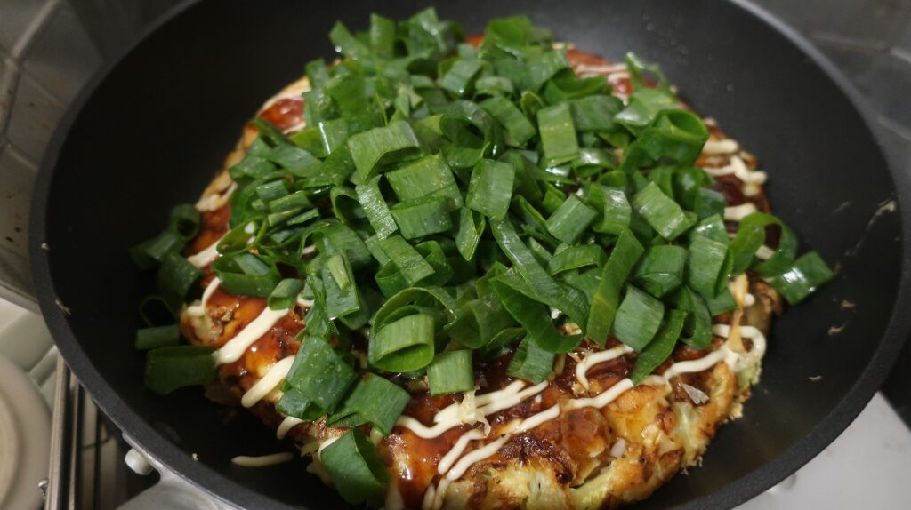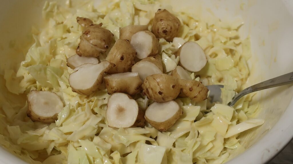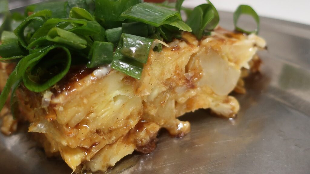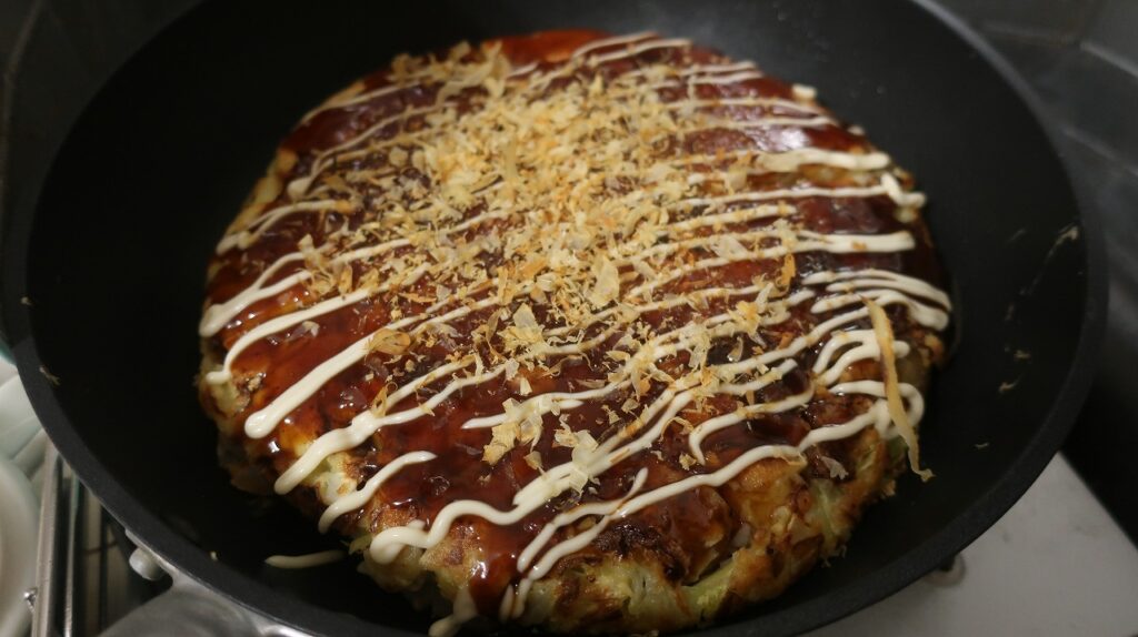 菊芋入れて、普通に焼いて、パパヤソース、マヨネーズ、いわし削り。