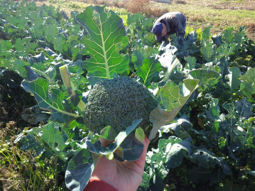 「いくらか大きくなってるだろ」とブロッコリーの収穫。