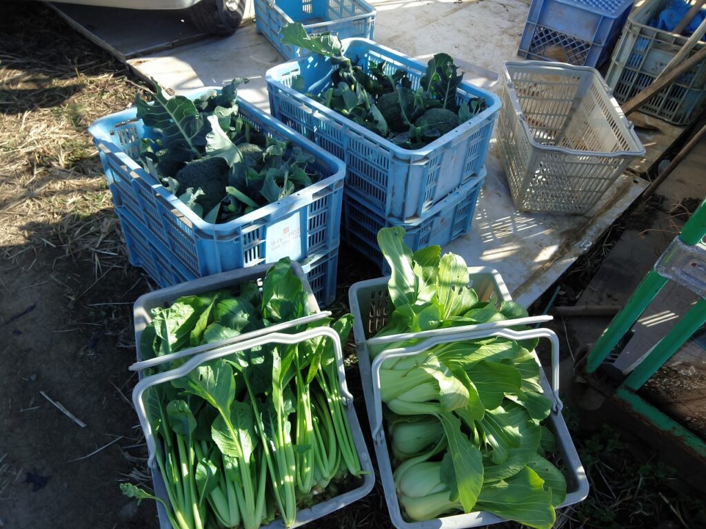 本日の収穫、ブロッコリー、チンゲンサイ、小松菜。