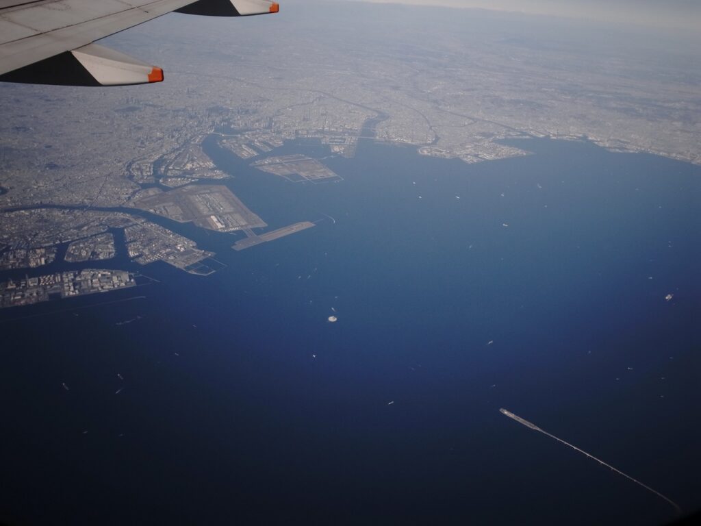 東京湾上空、アクアラインと海ほたるがよく見えます。