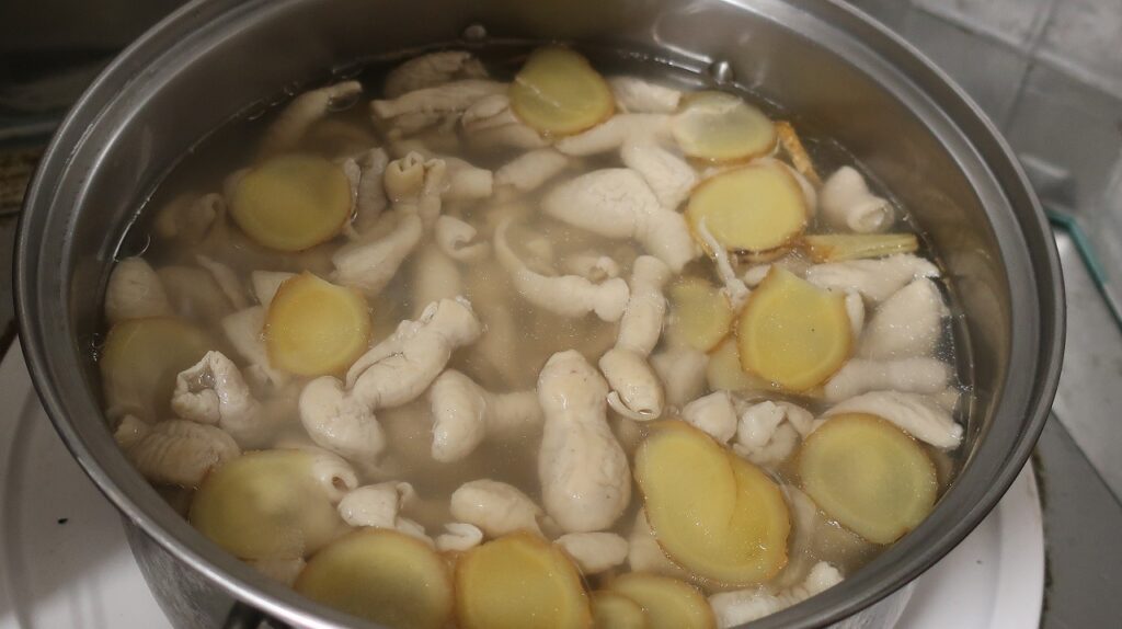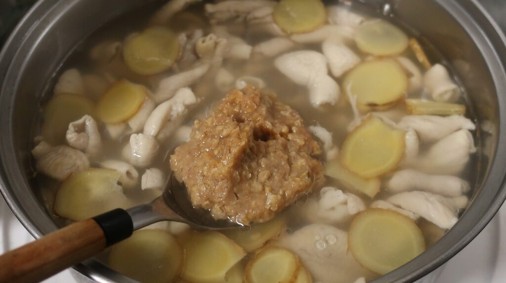 スーパーで買ってきたモツを数回お湯に通した後、松本さんの生姜をたっぷり入れてコトコト煮ます。