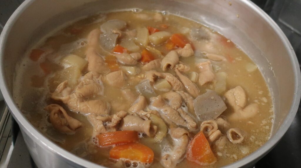 さて、今日のメインメニューはもつ煮で、前の日から仕込んでいました。