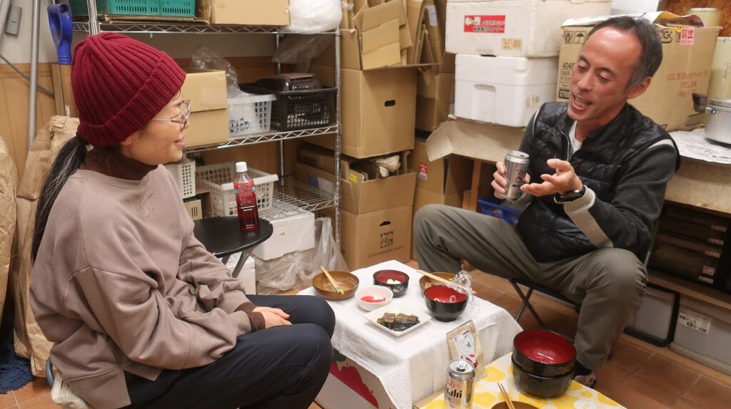 絹子を含め、今年は少人数のため、作業場でキャンプスタイルでの飲み会です。