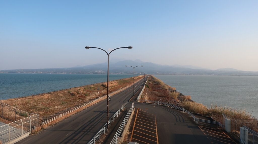 道の左側が有明海。