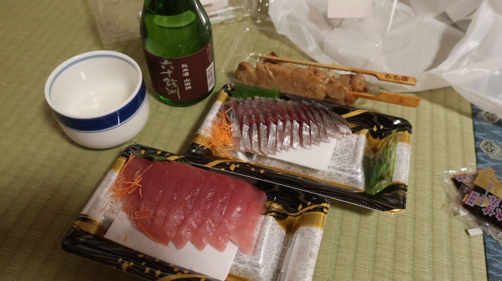 帰りにスーパーに寄ったら、刺し身と焼き鳥が半額だったので買ってきて、日本酒で一杯。